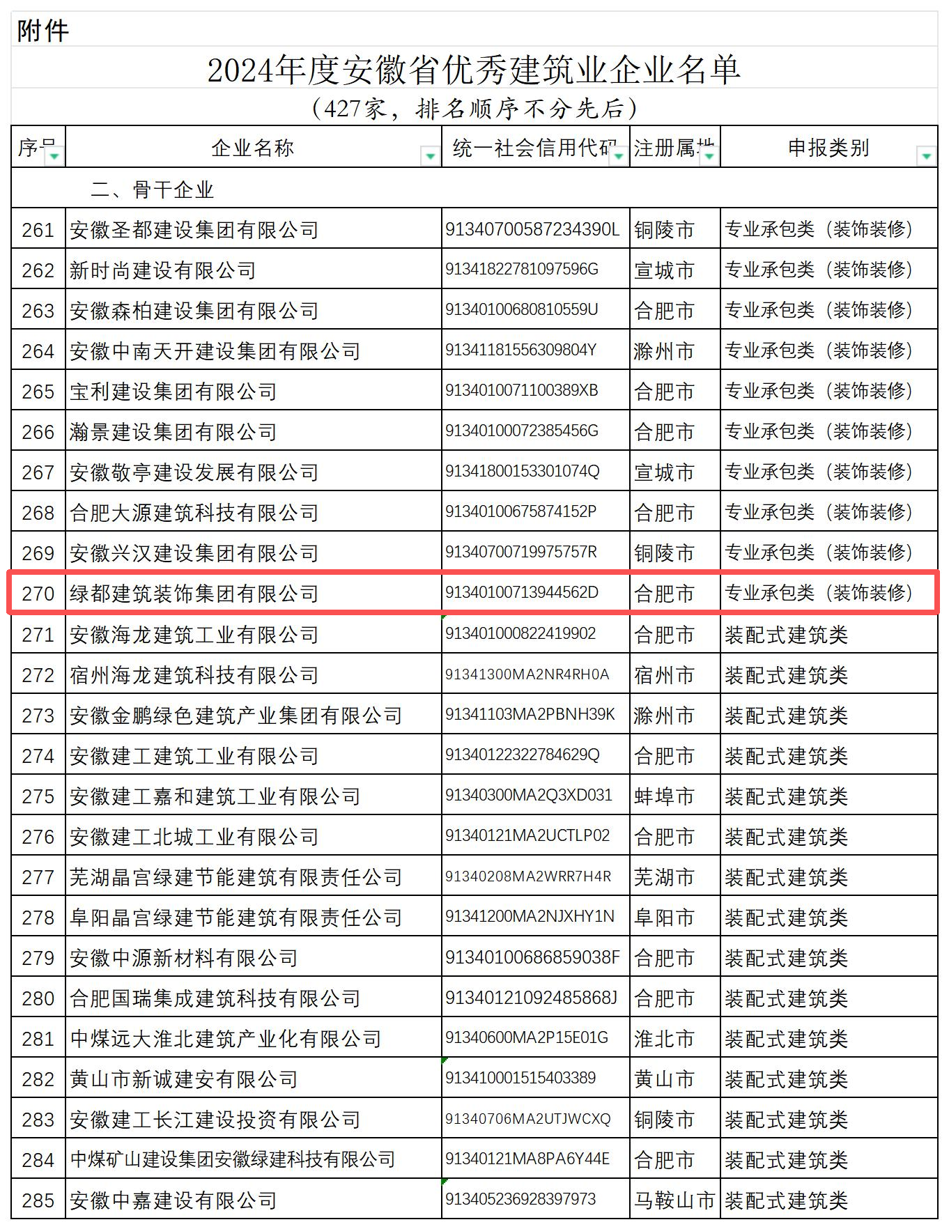 近日,安徽省住房和城乡建设厅发布了2024年度安徽省优秀建筑业企业名单的公告,根据《关于开展2024年度安徽省优秀建筑业企业认定工作的通知》(建办函〔2025〕474号),省住房城乡建设厅会同省交通运输厅、省水利厅、省通信管理局组织开展了2024年度安徽省优秀建筑业企业认定工作。经认定与公示,绿都集团被认定为“2024年度安徽省优秀建筑业企业”。